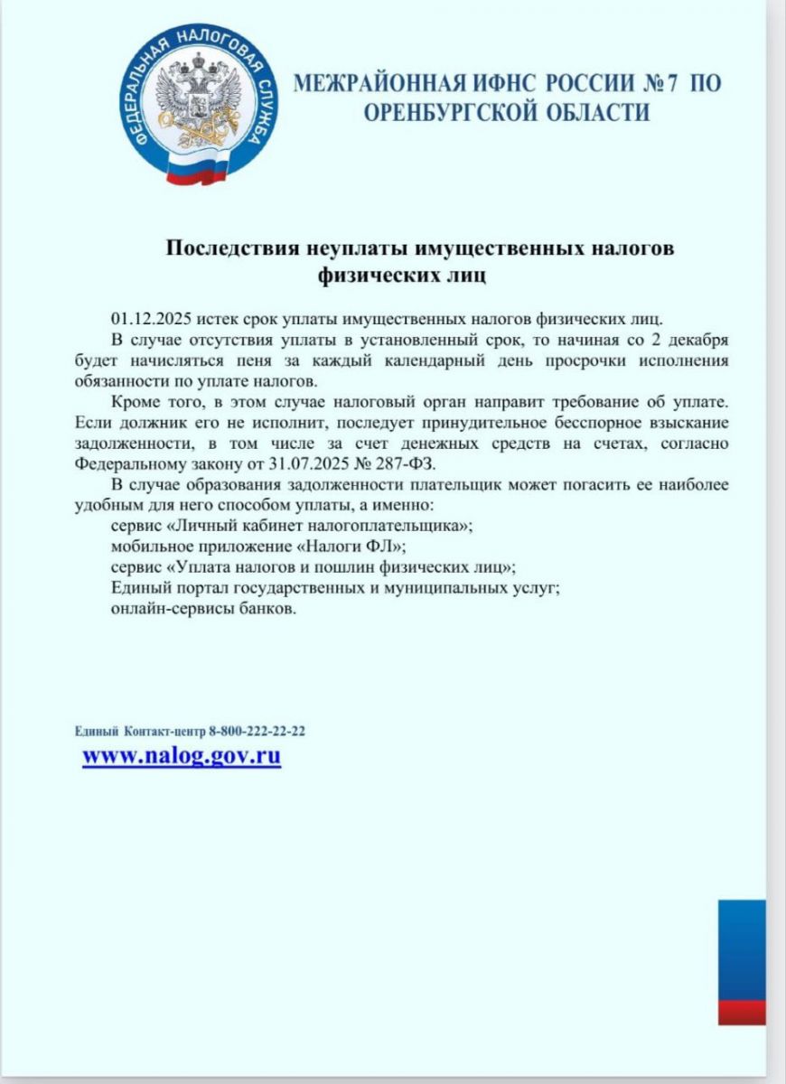 Срок уплаты имущественных налогов физических лиц - 1 декабря